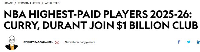 美媒Sportico公布2025-26賽季NBA總收入(年薪+代言收入)最高的20位球星榜單,詹姆斯1.326億美元高居首位,庫里1.096億美元第二,杜蘭特1.033億美元第三,其余球員均沒有超過1億美元。